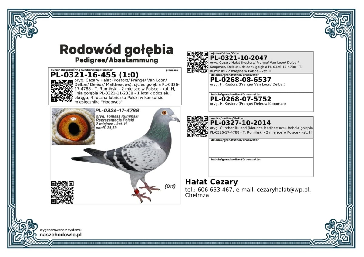 Hodowla: Rumiński Tomasz Numer ojca: PL-0321-10-2047 Numer matki: PL-0327-10-2014 Opis: ryg. Cezary Hałat (Kostorz/ Prange/ Van Loon/ Delbar/ Deleus/ Mattheeuws), ojciec gołębia PL-0326-17-4788 - T. Rumiński - 2 miejsce w Polsce - kat. H, linia gołębia PL-0321-11-2338 - 1 lotnik oddziału, okręgu, 4 roczna lotniczka Polski w konkursie miesięcznika "Hodowca"