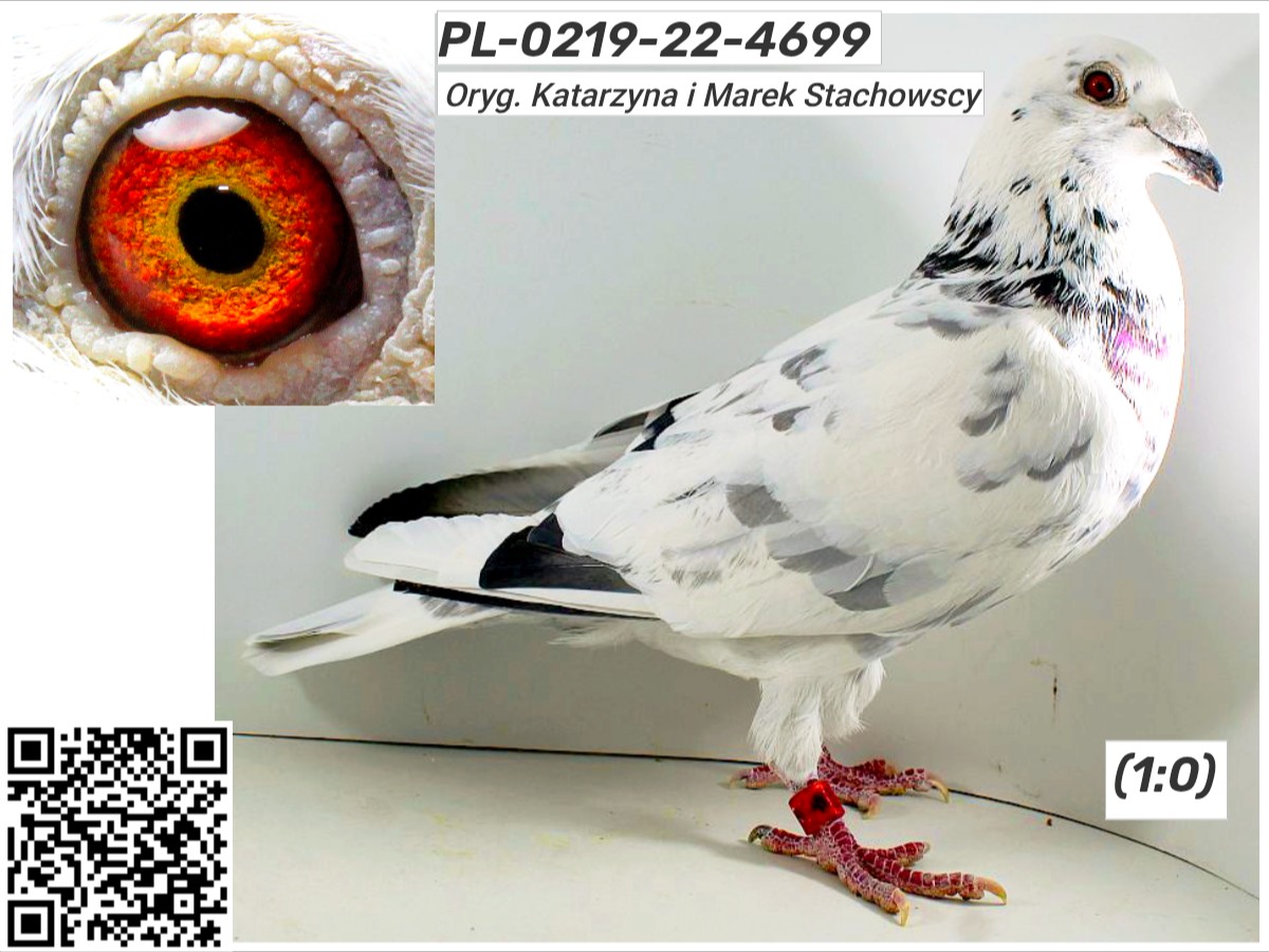 Oryg. Katarzyna i Marek Stachowscy Gołąb wyhodowany po lotach młodych Syn BIAŁEJ RAKIETKI 2 lotnik okręgu w kat. F Oryg. Greg Rockets