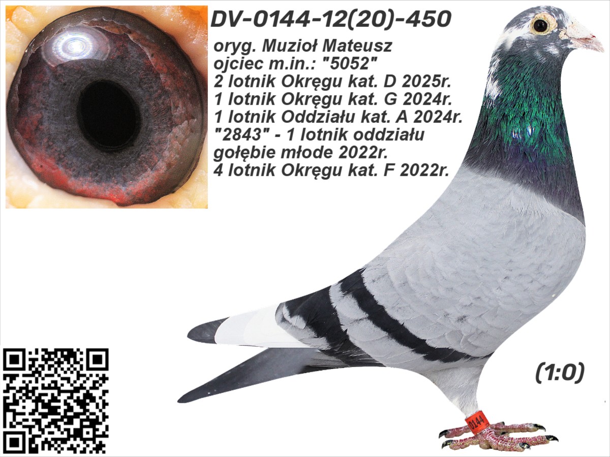 Hodowla: Prondzinski Filip Numer ojca: PL-0304-18-2166 Numer matki: PL-0426-18-6445 Opis: oryg. Muzioł Mateusz, ojciec m.in.: "5052" - 2 lotnik Okręgu kat. D 2025r., 1 lotnik Okręgu kat. G 2024r., 1 lotnik Oddziału kat. A 2024r.; "2843" - 1 lotnik oddziału gołębie młode 2022r., 4 lotnik Okręgu kat. F 2022r.