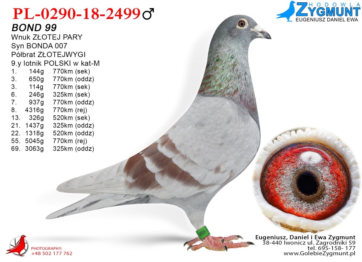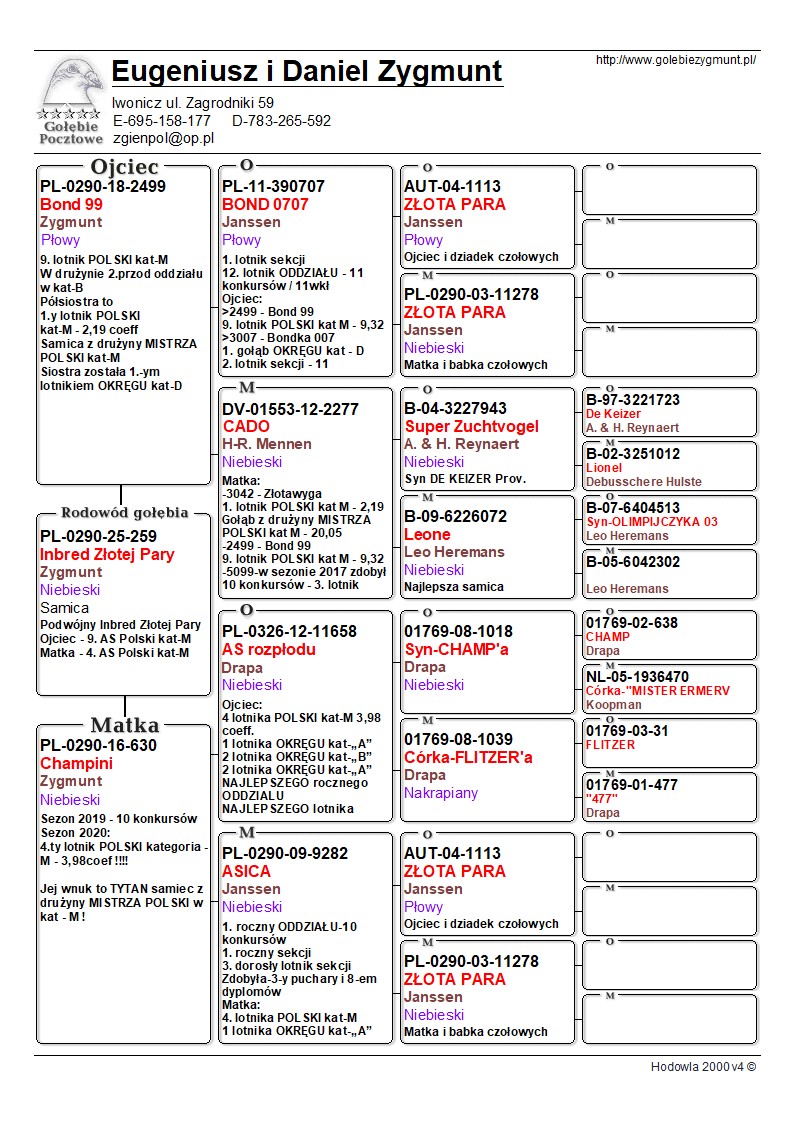 Numer ojca: PL-0290-18-2499 Numer matki: PL-0290-16-630 Opis: Samica pochodząca z podwójnego inbredu na słynną Złotą Parę. Ojciec – Bond 99, 9. AS Polski kat-M, linia pełna mistrzowskich wyników. Matka – Champini, 4. lotnik Polski kat-M, córka Asa Rozpłodu i Asicy. W rodowodzie same pewne linie Drapa i Janssen – gołąb o ogromnym potencjale hodowlanym.
