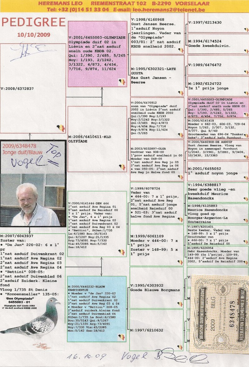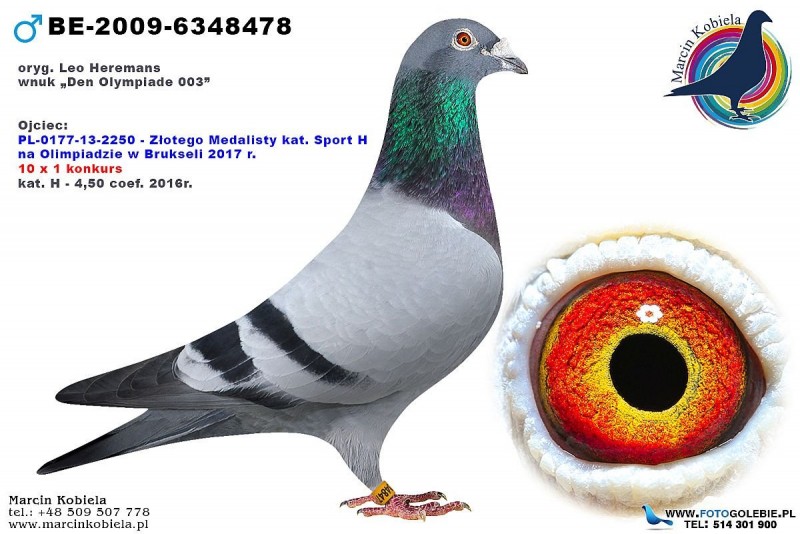 Hodowla: Prondzinski Filip Numer ojca: BELG-2008-6372837 Numer matki: BELG-2007-6043937 Opis: oryg. Leo Heremans, ojciec olimpijczyka "2250", złoty medal kat. H - Olimpiada Bruksela 2017r., coeff. 4,50 - 10x1k., kat. D - coeff. 16,10 za lata 2015/2016