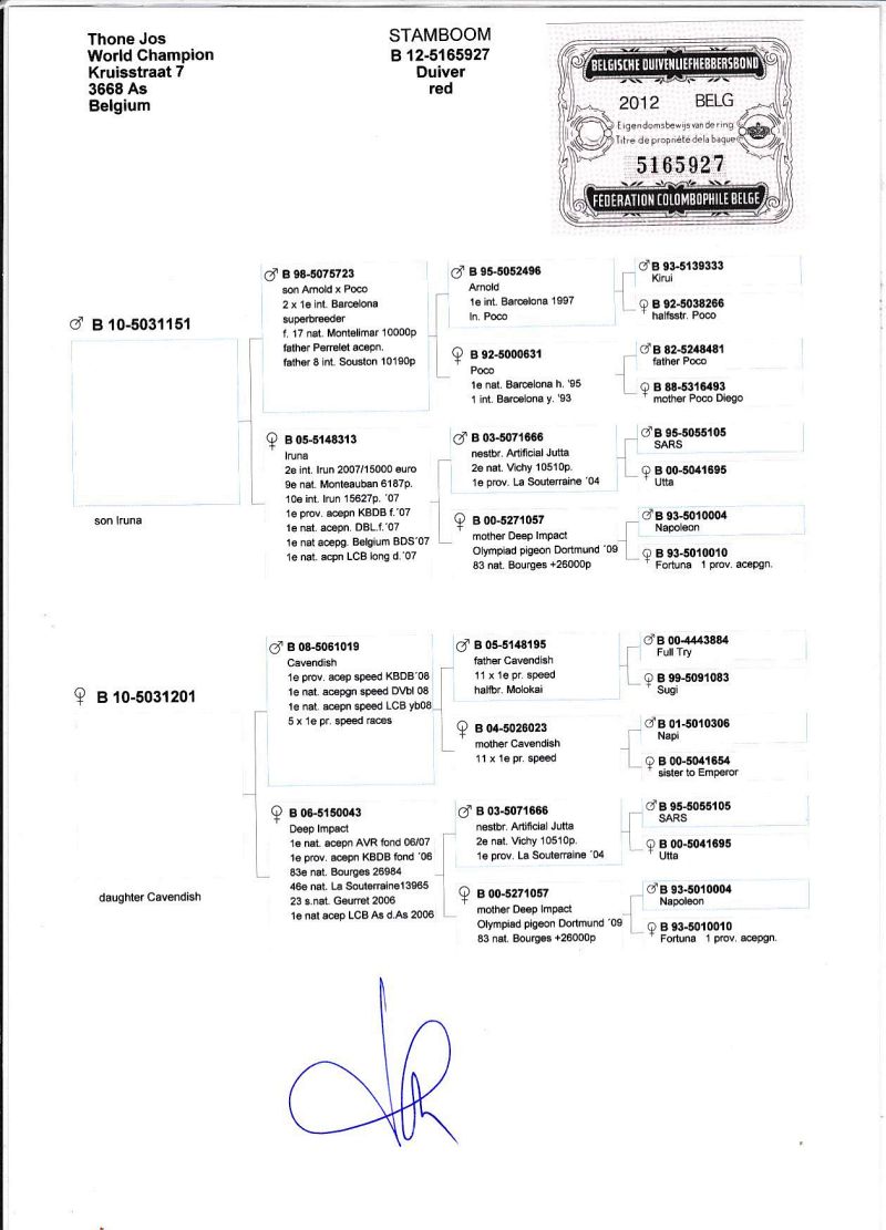 oryg. Jos Thone, wnuk "Iruna" - 2 miejsce z międzynarodowego lotu Irun 2007, "Cavendish" - 1 prov. Ace speed KBDB 2008r.