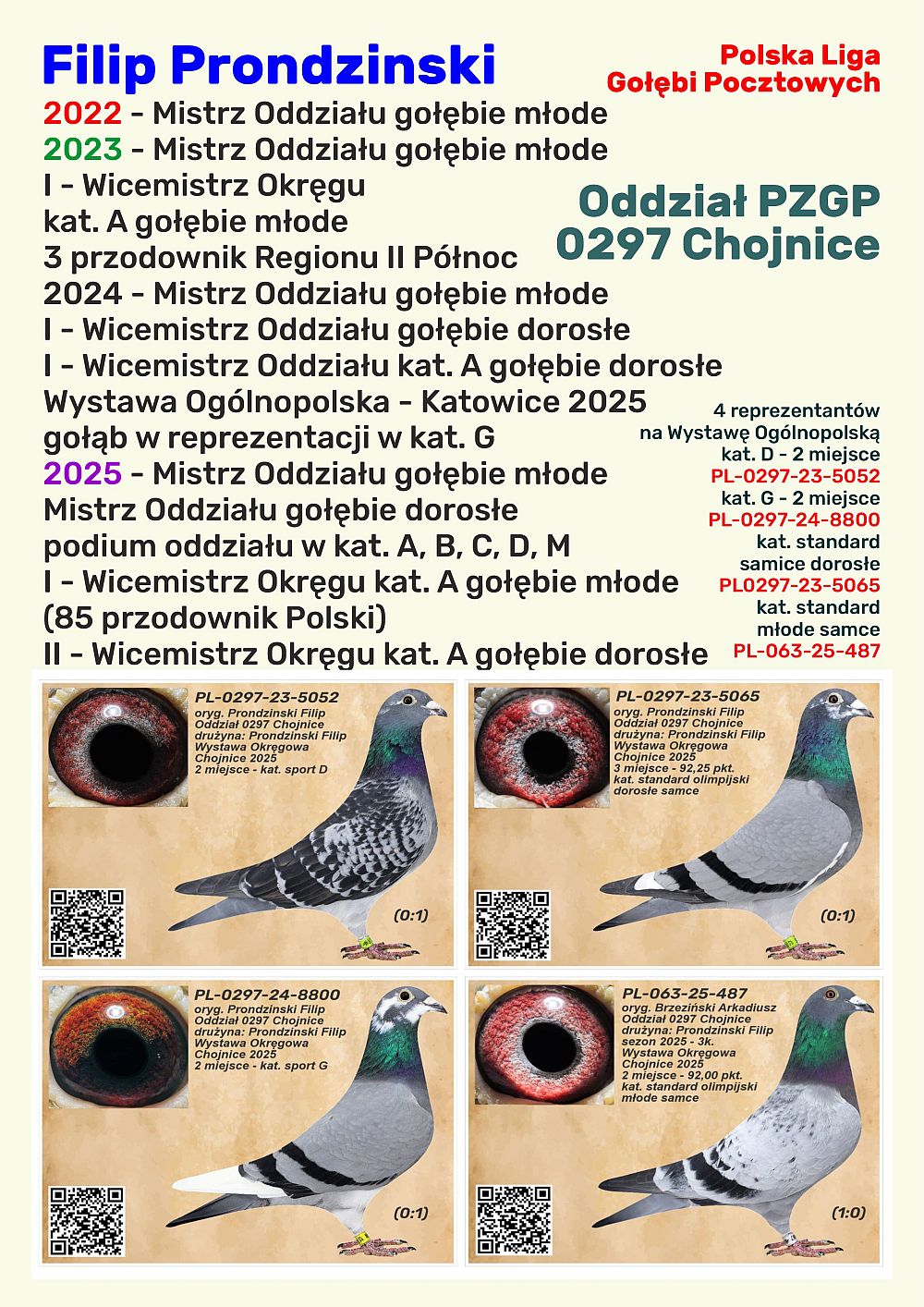 | 2022 - Mistrz Oddziału gołębi młodych 2023 - Mistrz Oddziału gołębi młodych I - Wicemistrz Okręgu kat. A gołębi młodych 3 przodownik Regionu II Północ 2024 - Mistrz Oddziału gołębi młodych I - Wicemistrz Oddziału gołębi dorosłych I - Wicemistrz Oddziału kat. A gołębi dorosłych 1 reprezentant na Wystawę Ogólnopolską w kat. G 2025 - Mistrz Oddziału gołębi młodych Mistrz Oddziału gołębi dorosłych podium oddziału kat. A, B, C, D, M I - Wicemistrz Okręgu kat. A gołębi młodych (85 przodownik Polski) II - Wicemistrz Okręgu kat. A gołębi dorosłych 4 reprezentantów na Wystawę Ogólnopolską: kat. D - 2 lotnik kat. G - 2 lotnik kat. standard samice dorosłe kat. standard młode samce |