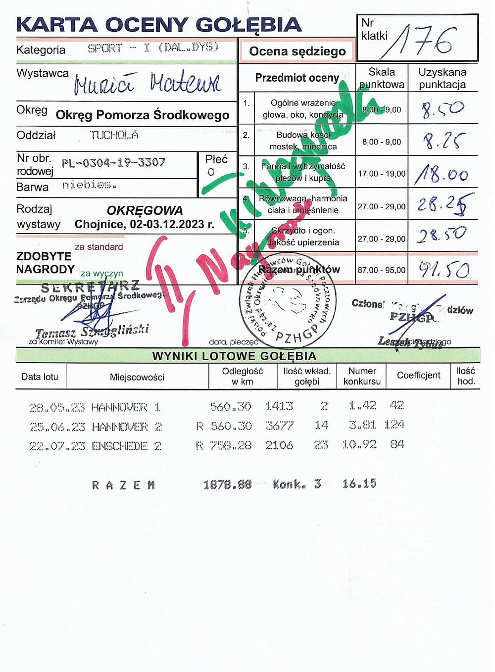oryg. Mateusz Muzioł - gołąb lotowy, 16 Lotnik Regionu II Północ 2021 w drużynie 11 Przodownika Polski Kat. C - 2021r.