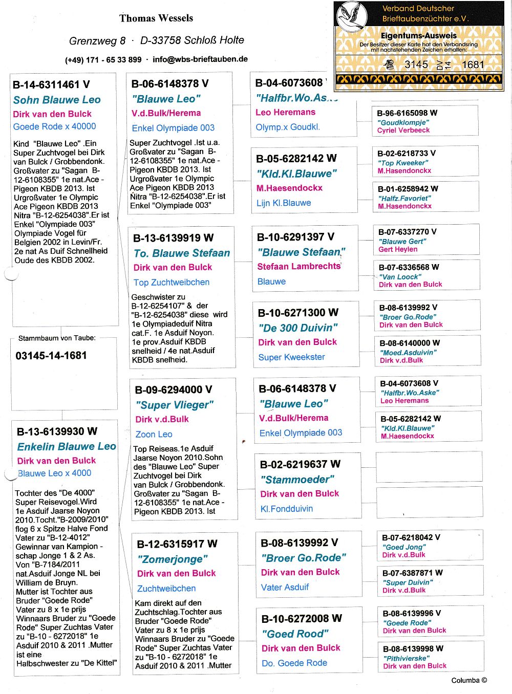 oryg. Wessels Thomas (100% Dirk Van den Bulck), inbred "Blauwe Leo",