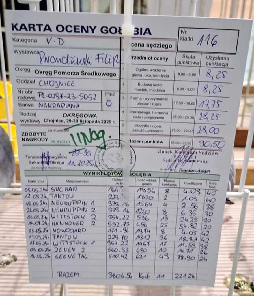Hodowla: Polska Liga Gołębi Pocztowych 2025 Opis: oryg. Prondzinski Filip - Oddział 0297 Chojnice, drużyna: Prondzinski Filip, Wystawa Okręgu Pomorza Środkowego - Chojnice 2025 - 2 miejsce - kat. sport D, Reprezentant Okręgu na Wystawę Ogólnopolską Katowice 2026