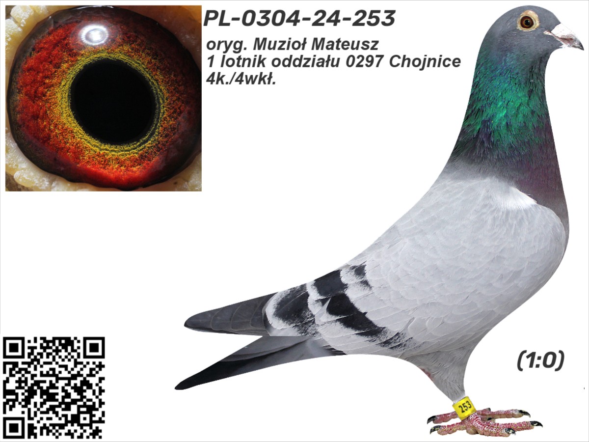 oryg. Muzioł Mateusz, 1 lotnik Oddziału 0297 Chojnice 4k./4wkł., gołąb zdobył m.in.: 8k./774goł. (339km), 37k./2487goł. (138km)