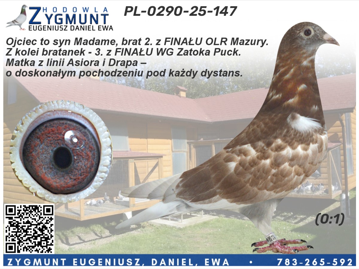 Hodowla: Zygmunt E. D. i E.  Numer ojca: PL-0290-22-5006  Numer matki: PL-0290-21-1531  Opis: Samiczka o wyjątkowym pochodzeniu – wnuczka znakomitej lotniczki Madame.