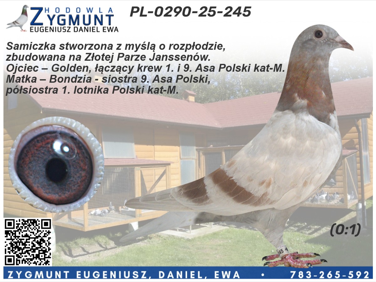 Hodowla: Zygmunt E. D. i E.  Numer ojca: PL-0290-16-6399  Numer matki: PL-0290-20-6158  Opis: Samiczka stworzona z myślą o rozpłodzie, zbudowana na Złotej Parze Janssenów.