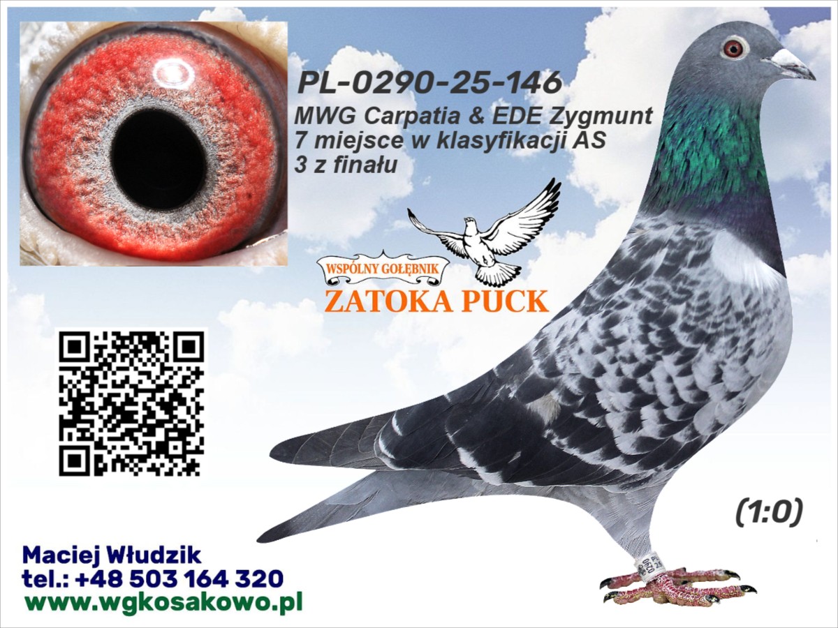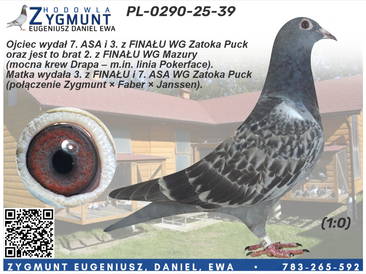 Numer ojca: PL-0290-23-153 Numer matki: PL-0290-23-190 Opis: Piękny samiec z topowej, sprawdzonej linii lotników. Ojciec wydał 7. ASA i 3. z FINAŁU WG Zatoka Puck oraz jest to brat 2. z FINAŁU WG Mazury (mocna krew Drapa – m.in. linia Pokerface). Matka wydała 3. z FINAŁU i 7. ASA WG Zatoka Puck (połączenie Zygmunt × Faber × Janssen).Rodzeństwo regularnie melduje się w czołówkach, potwierdzając jakość rodziny na WG i w oddziałach. Gołąb o świetnym pochodzeniu, predysponowany do lotów średnich i dalszych dystansów, idealny do wzmocnienia gołębnika hodowlanego i lotowego.
