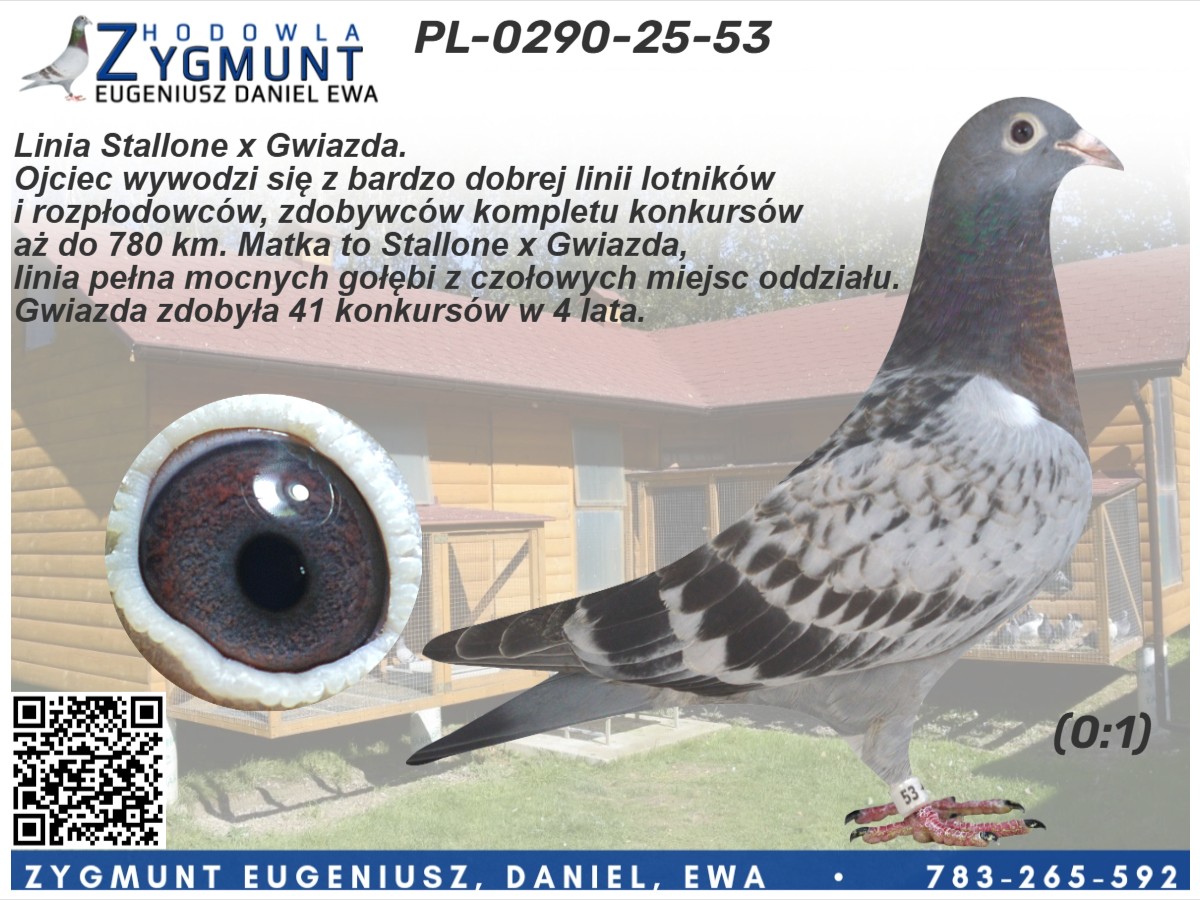 Ojciec wywodzi się z bardzo dobrej linii lotników i rozpłodowców, zdobywców kompletu konkursów aż do 780 km. Matka to Stallone x Gwiazda, linia pełna mocnych gołębi z czołowych miejsc oddziału. Gwiazda zdobyła 41 konkursów w 4 lata. Rodzeństwo odnosi sukcesy na każdym dystansie – gwarancja solidnego materiału hodowlanego.