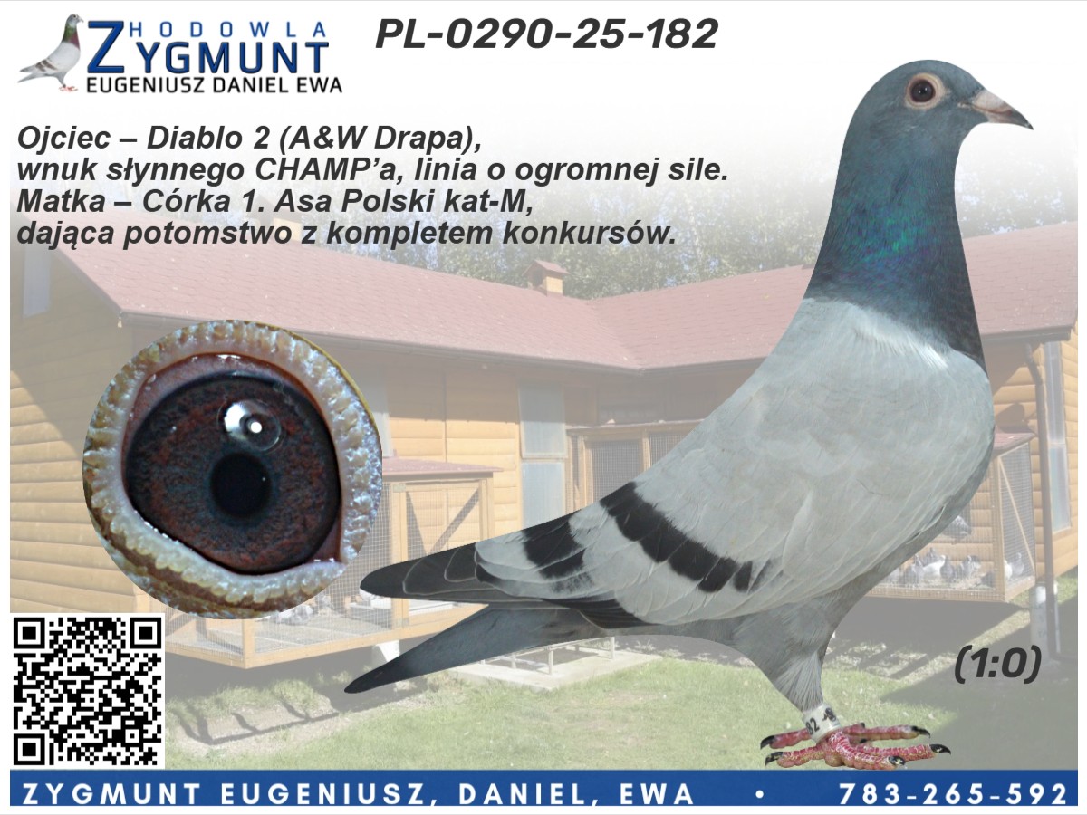Hodowla: Zygmunt E. D. i E.  Numer ojca: DV-071-20-1232  Numer matki: PL-0290-23-40  Opis: Samiec z linii Drapa × Janssen, wybitnie zbudowany, idealny w typie lotnym.