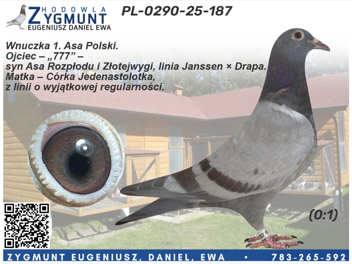 Hodowla: Zygmunt E. D. i E.  Numer ojca: PL-0290-24-3777  Numer matki: PL-0290-24-3789  Opis: Samiczka z jednej z najpewniejszych linii w hodowli — wnuczka 1. Asa Polski.