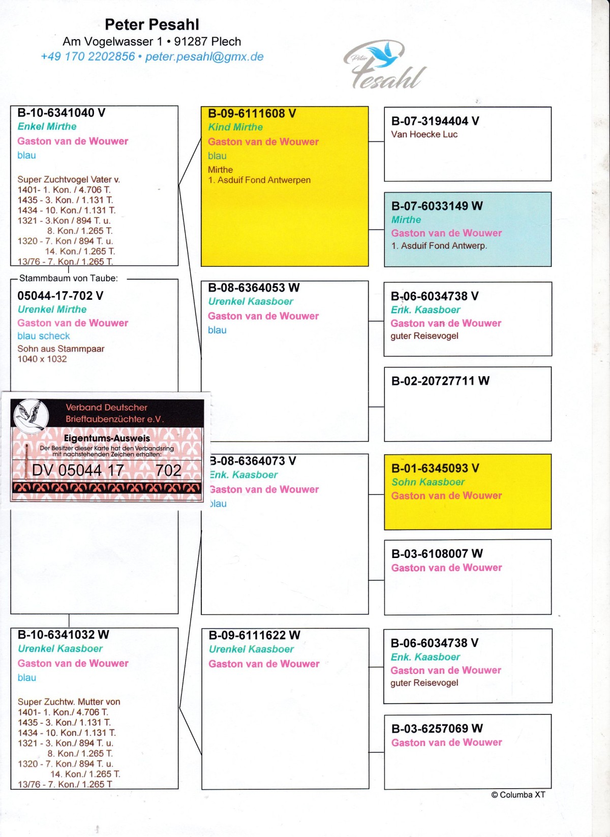 oryg. Pesahl Peter (100% Gacton Van de Wouwer), linia podstawowej pary rozpłodowej