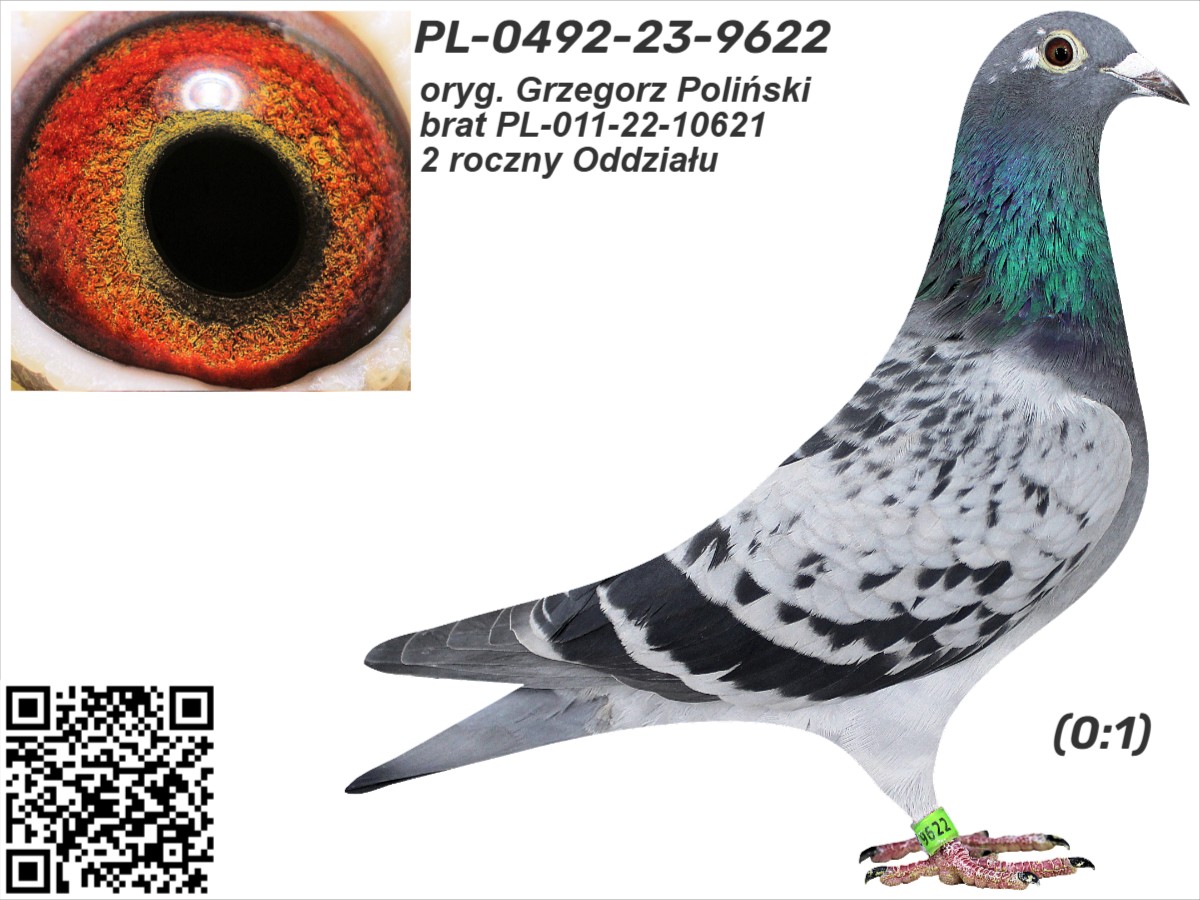 Numer ojca: PL-DB-19-997577 Numer matki: PL-011-18-13173 Opis: oryg. Grzegorz Poliński, brat PL-011-22-10621 - 2 roczny Oddziału, jest matką m.in.: "7812" - 4 lotnik oddziału w lotach gołębi młodych (2025r.) oraz gołąb z drużyny I-vice mistrza Okręgu Kat. A gołębie młode (85 przodownik Polski); jest również matką wielu czołowych lotników oddziału, gołąb zakupiony na aukcji charytatywnej na Wystawie Okręgu Podlasie w 2023r.