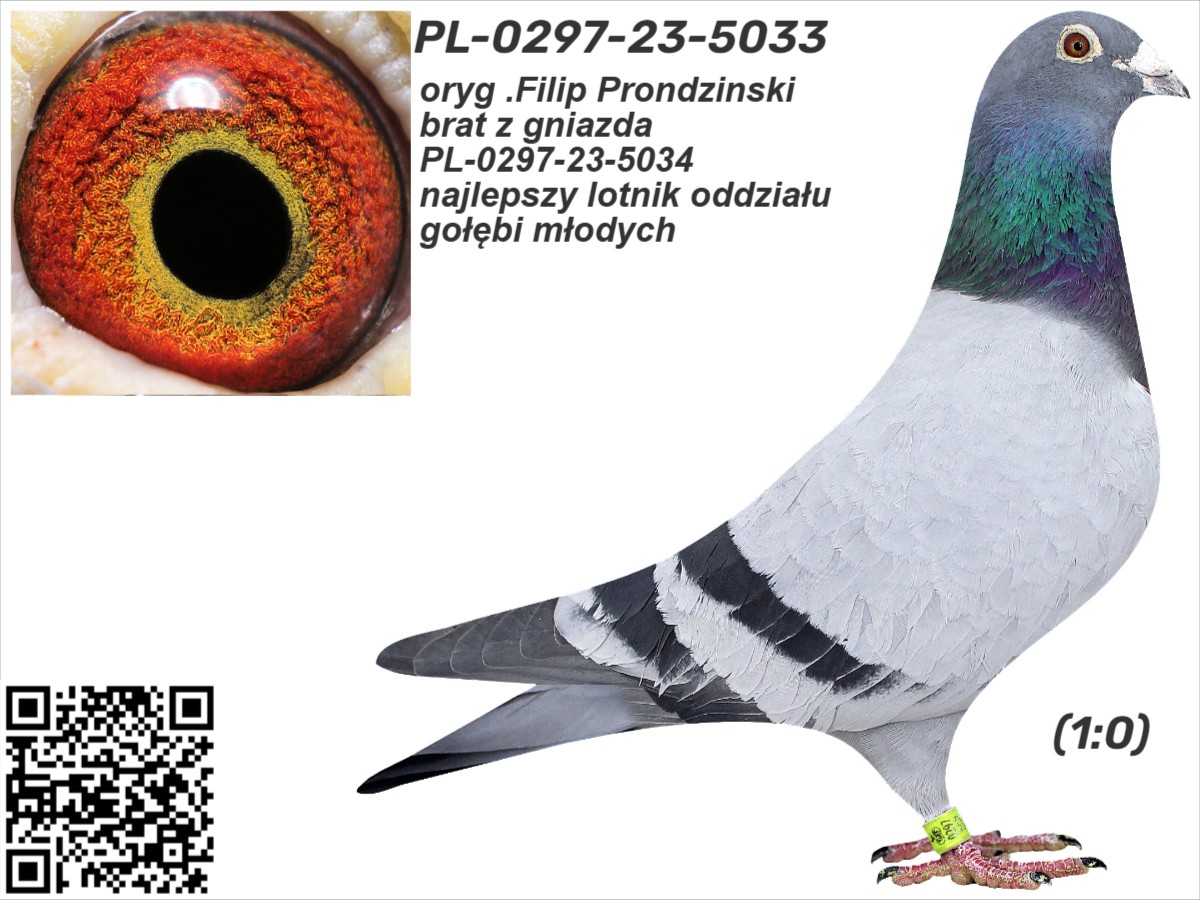 Numer matki: PL-0304-19(20)-3271 Opis: oryg .Filip Prondzinski, brat z gniazda PL-0297-23-5034 - najlepszy lotnik oddziału gołębi młodych 2023, gołąb zdobył m.in: 17k./1095goł. (229km), 41k./1216goł. (229km), 62k./2279goł. (164km), 62k./1564goł. (339km) itd.