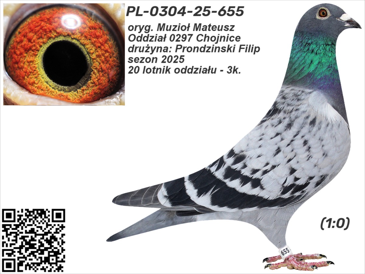 oryg. Mateusz Muzioł, 20 lotnik oddziału 0297 Chojnice w lotach gołębi młodych, gołąb zdobył m.in: 54k./1822goł. (171km), 65k./1752goł. (197km)