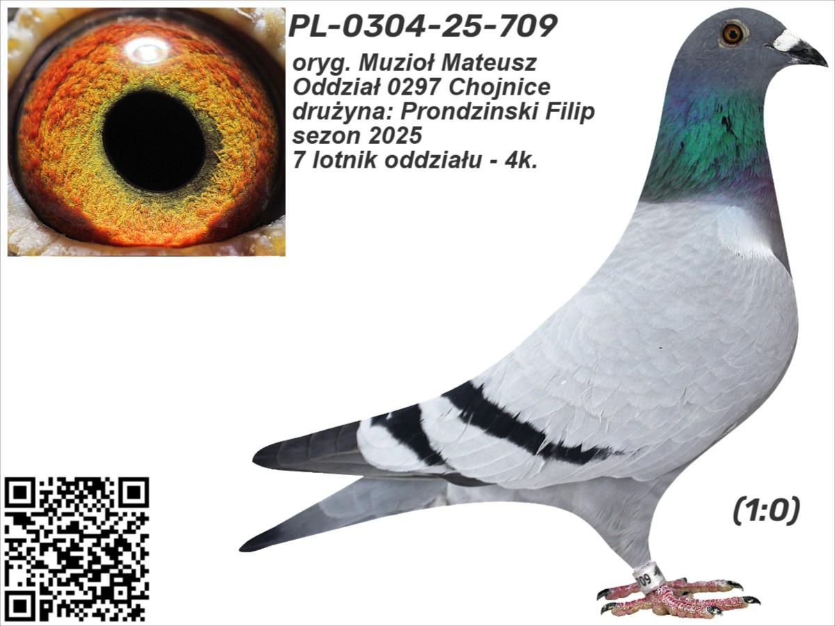 Hodowla: Prondzinski Filip Numer ojca: DV-07814-24-87 Numer matki: PL-0304-23-2667 Opis: oryg. Mateusz Muzioł, 7 lotnik oddziału 0297 Chojnice w lotach gołębi młodych (4k./4wkł.), gołąb zdobył m.in: 5k./2409goł. (138km), 21k./1822goł. (171 km)